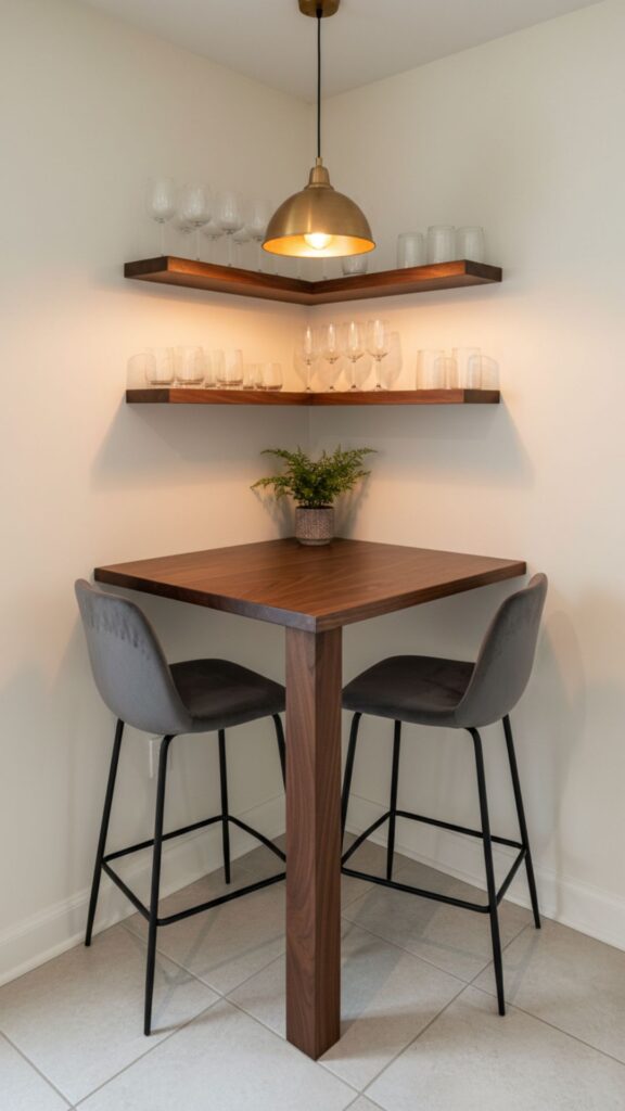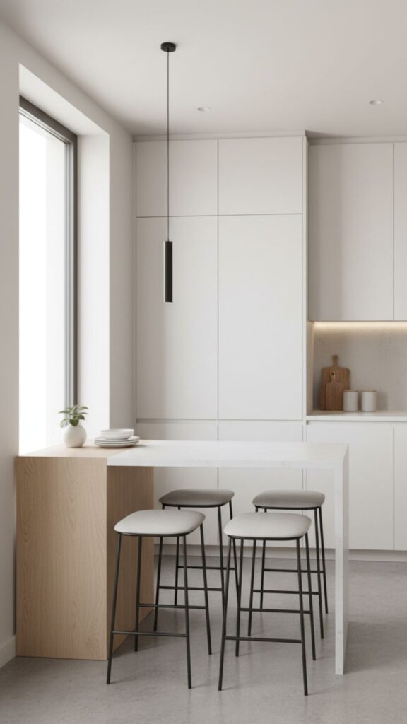 Corners are often dead space in a kitchen. By utilizing a curved or triangular bar table in a corner, you create a cozy dining spot without encroaching on the central cooking zone.