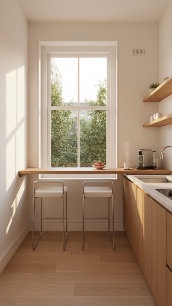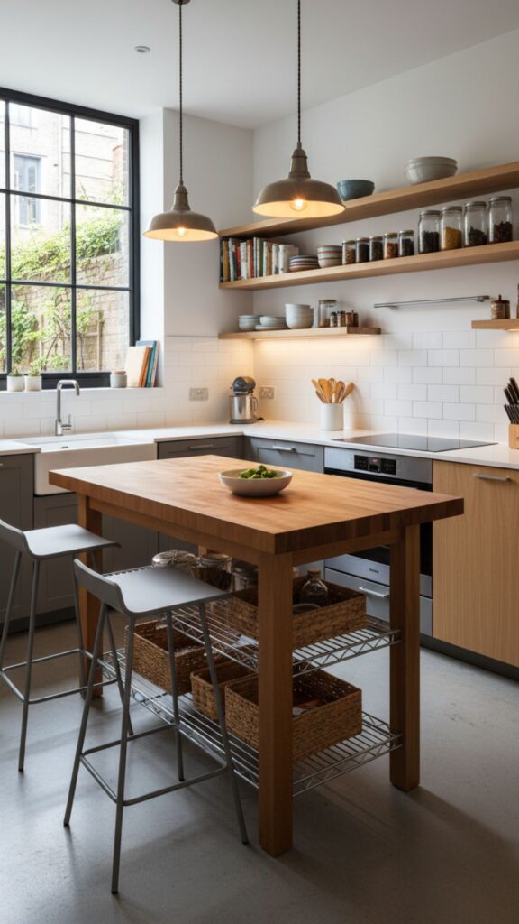 Versatility is key in small spaces. A rolling cart acts as prep space, storage, and a breakfast bar all in one. Because it’s mobile, you can push it aside when you need more floor area for cooking.