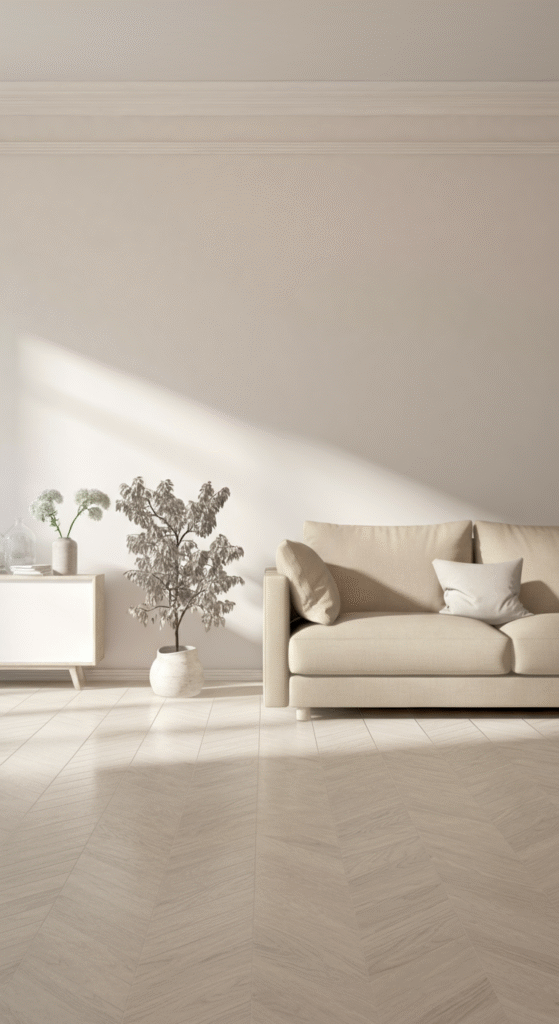 Layer different neutral shades instead of sticking to one flat tone. Think white walls, soft-grey sofas, and natural oak furniture. The contrast creates depth while staying minimalist.