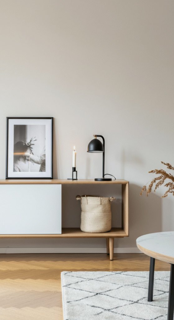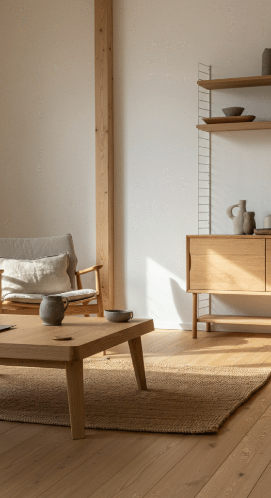 Look for furniture with clean silhouettes, natural finishes, and functional design. Think low-profile sofas, wooden coffee tables, and simple storage units. Avoid ornate or bulky pieces.