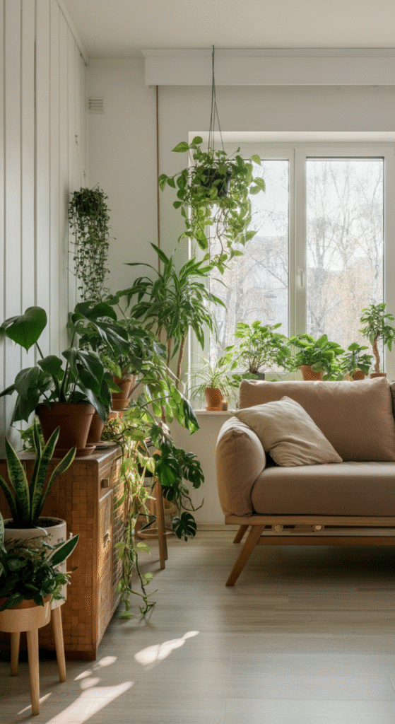 For smaller rooms, go vertical — hang planters or mount a small green wall.