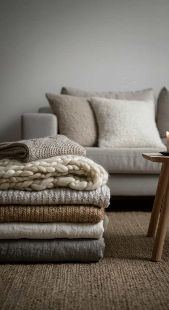 Layer textiles — wool throws, linen cushions, cotton rugs, and knitted blankets. Mix different textures in a consistent color palette to avoid visual clutter.