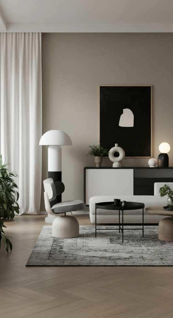 Even small details, like a black coffee table leg or a minimal floor lamp, can redefine the entire aesthetic.