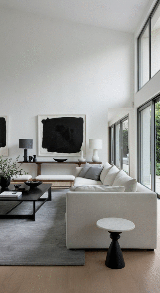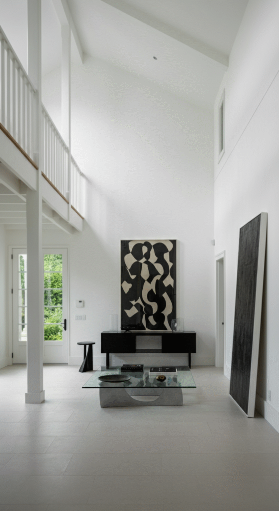 - Add Statement Art: A large piece of modern artwork or a sleek mirror can be the perfect focal point for your high walls.