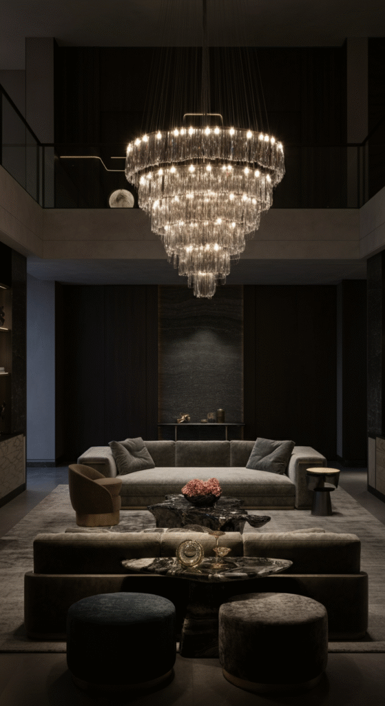 - High-End Lighting: Opt for sculptural lighting fixtures, like oversized chandeliers or sleek, modern pendant lights, to accentuate the height of the room.