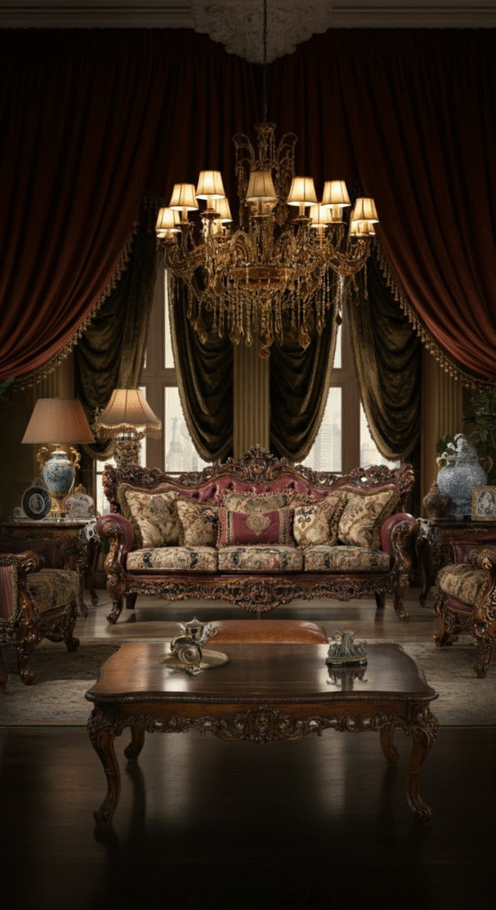 - Rich Fabrics: Velvet, silk, and brocade fabrics for sofas and drapery will add texture and luxury to the space.