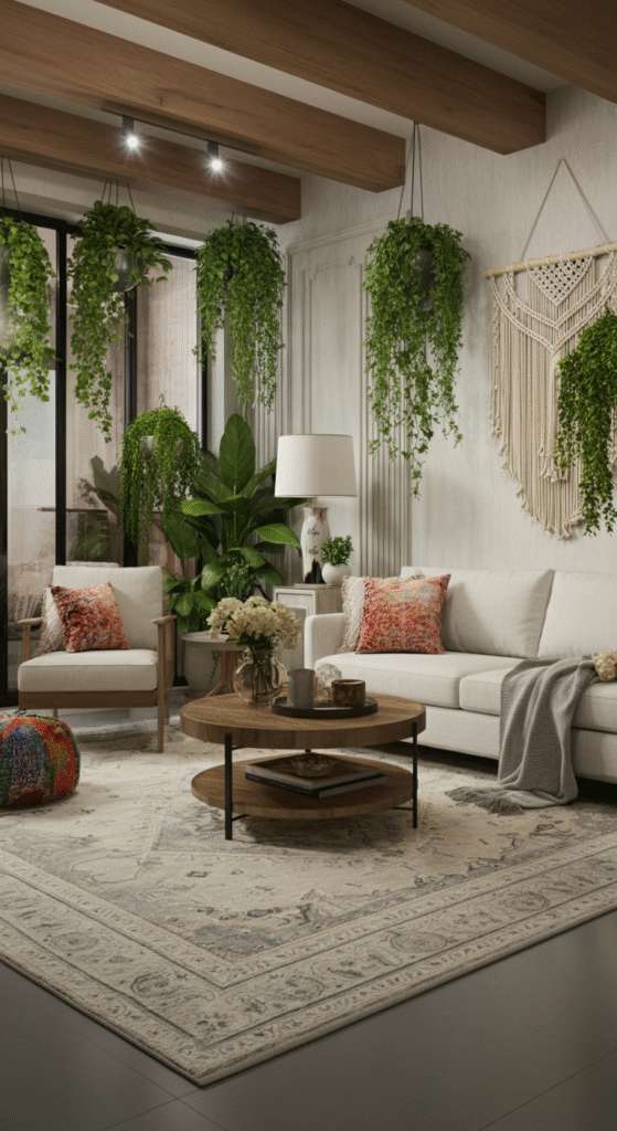 A bohemian living room style is all about mixing textures, colors, and patterns in a relaxed, effortless way. This eclectic style works wonderfully with high ceilings, as it gives you the freedom to layer various elements without making the space feel cluttered.