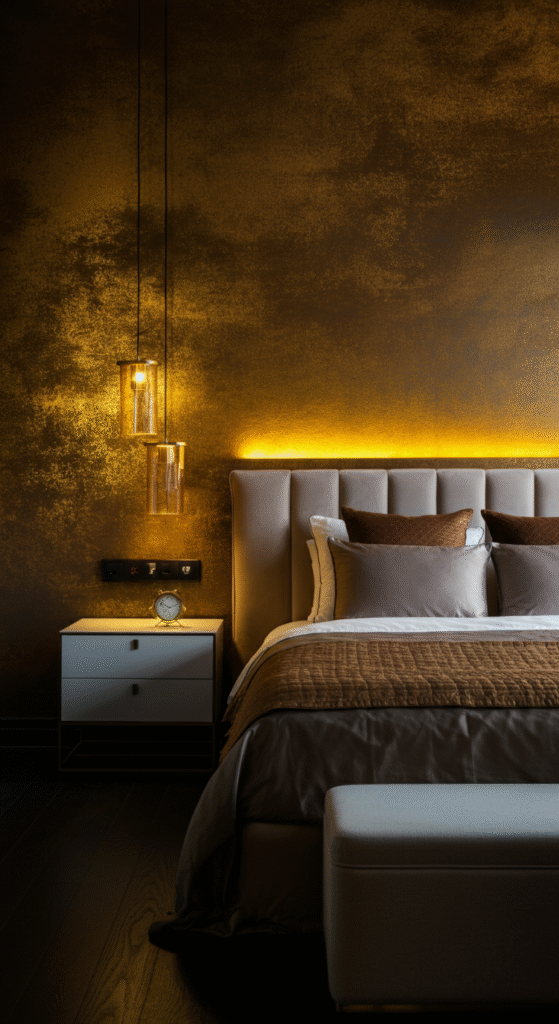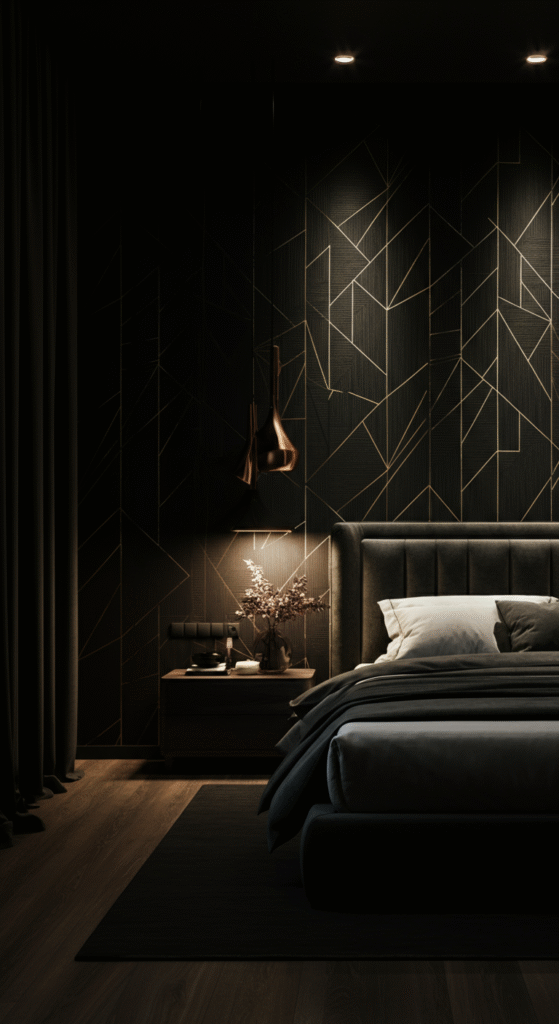 Depending on your taste, you can go for gentle champagne gold, aged bronze, or cool silver tones. These work wonderfully in bedrooms with minimal furniture because the wallpaper itself becomes the statement piece.