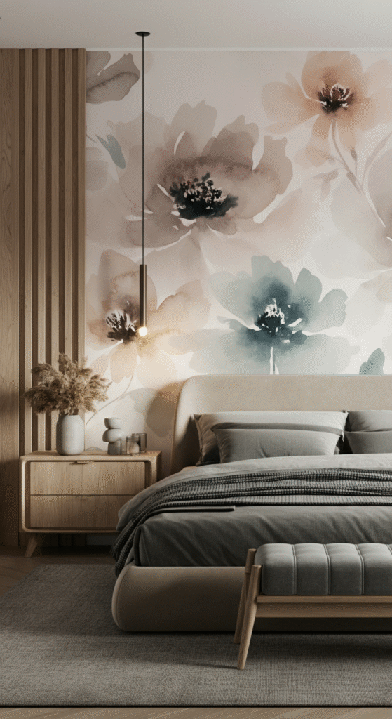 Imagine oversized peonies, watercolor botanicals, or monochrome roses stretching across your wall. When done right, they make your bedroom feel curated and calm rather than busy.