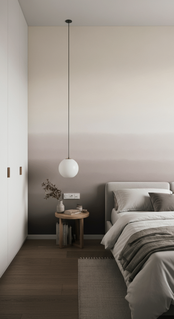 You can choose soft neutrals for a peaceful aesthetic or bolder gradients for a dramatic effect. Bedrooms with high ceilings or large windows benefit a lot from this wallpaper style.