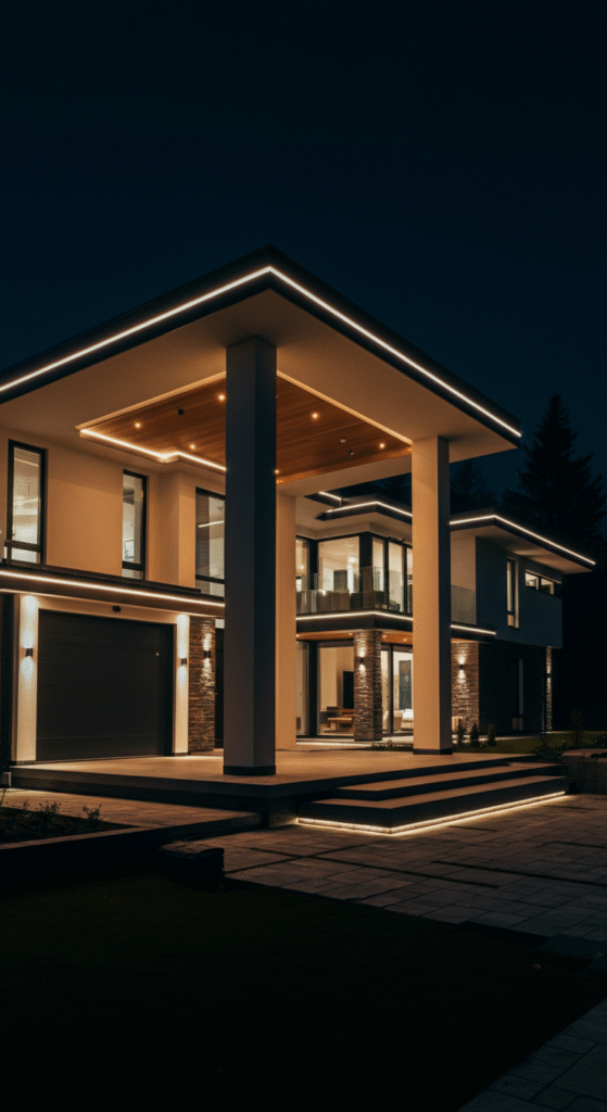 Outline the rooflines, pillars, balconies, entry arches, or sunken windows with warm white LED strips. Use straight lines only—no zig-zags, no multi-color mess. This creates a clean, structured, high-value look.