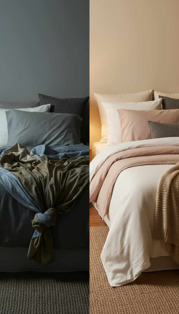 Since the bed is the focal point, messy or uninspired bedding ruins the whole room. Flat pillows and wrinkled synthetic sheets look unkempt, not minimal.