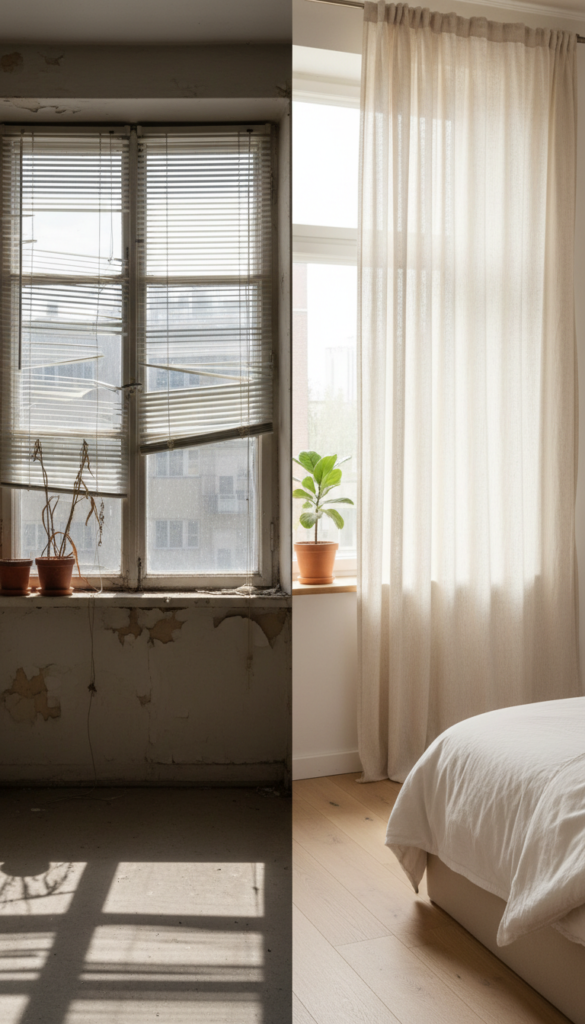 Leaving windows bare or using cheap plastic blinds detracts from the luxury of simplicity. Light control and privacy are essential for a bedroom’s function and aesthetic.