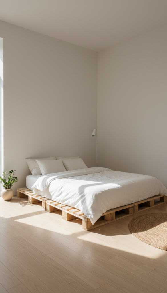 Ground your space—literally. A low-profile bed frame, particularly one made of light wood or pallets, instantly creates a relaxed, unpretentious atmosphere. It opens up vertical space, making the room feel airier and less crowded.