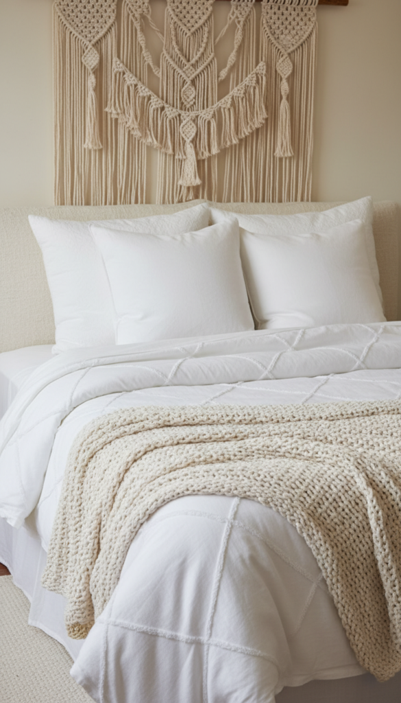 You don’t need color to create interest. In a minimalist boho room, texture is your best friend. Layering different shades of white, cream, and ivory adds depth without visual clutter.