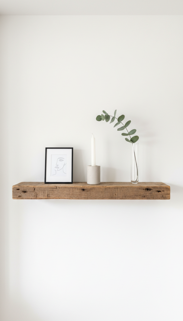 Clear the floor space to enhance the minimalist aesthetic. A single floating shelf made of reclaimed wood adds rustic charm and provides a specific spot for curated decor.