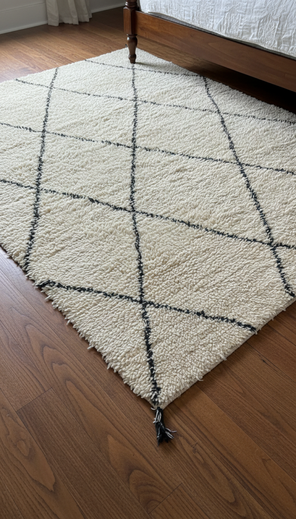 - Look for a Moroccan Beni Ourain style rug (cream with thin black lines).