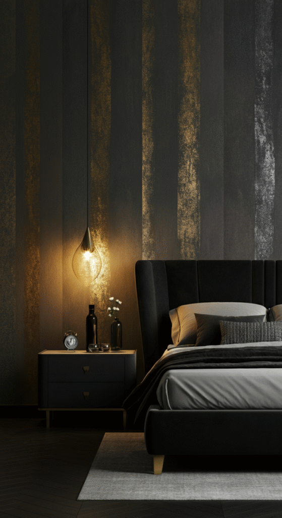 Metallic wallpapers don’t have to be flashy. Modern designs use soft gold, rose gold or silver accents on matte backgrounds.