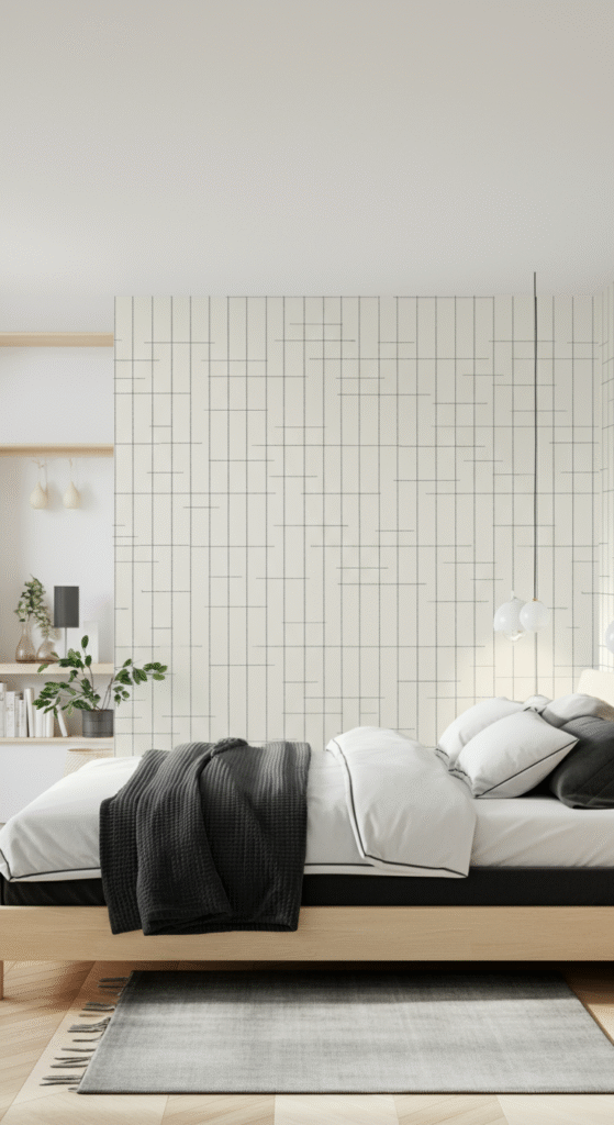 Lines, grids, triangles, hexagons or scallop patterns add movement without overwhelming the room. They work especially well in modern or minimalist bedrooms where the furniture already has clean shapes.