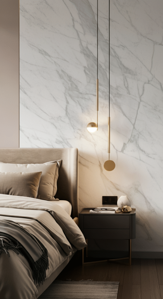 The veined patterns add movement and luxury while still keeping the bedroom clean and contemporary. White marble with grey streaks is the classic choice, but beige marble, soft gold veins or even black marble for bold contrast are trending too.