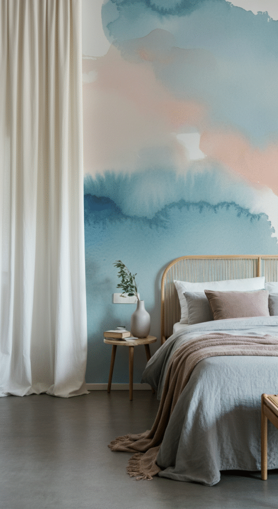 Soft blends of blues, greys, blush pinks or warm sand tones flow across the wall and give your bedroom a dreamy, fresh mood. It’s perfect if you want your interiors to feel effortless and creative.
