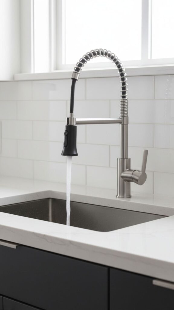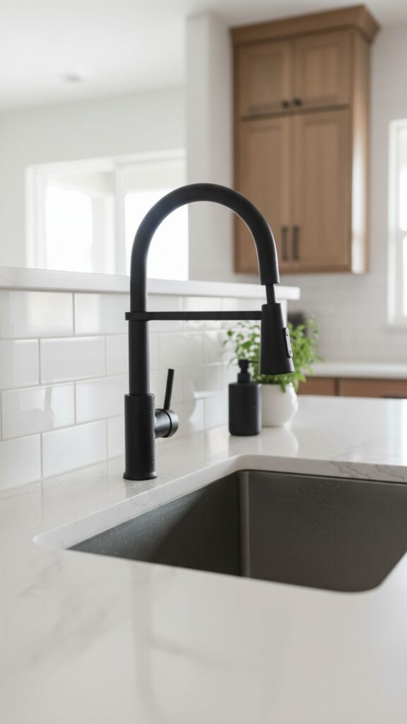 A matte black faucet acts as a sculptural centerpiece. It provides a sharp, sophisticated contrast against white countertops or subway tiles, instantly modernizing the sink area.
