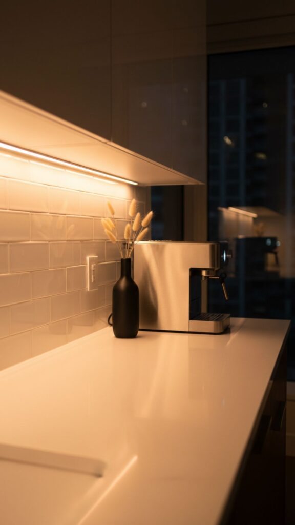 Good lighting transforms a room. Under-cabinet lighting eliminates shadows on countertops, making prep work easier while adding a soft, expensive-looking ambient glow at night.