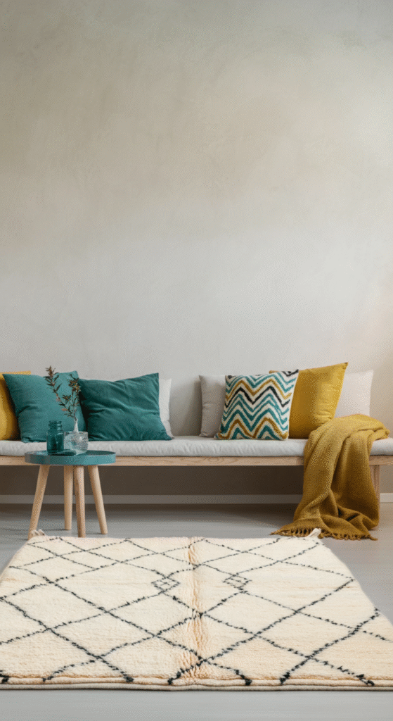 Moroccan rugs are all about luxury, texture, and tradition. Their signature diamond patterns and shaggy textures create a cozy yet exotic vibe in any living room.