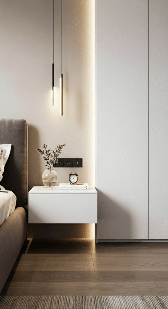 Floating nightstands are a smart choice for clean interiors. Mounted directly to the wall, they reduce visual clutter and make floor space feel uninterrupted.