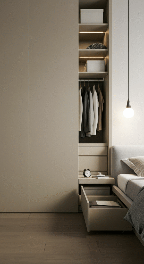 Use handle-less cabinets or push-to-open drawers for a seamless appearance. When storage blends into walls, the bedroom feels more like a peaceful retreat than a storage area.