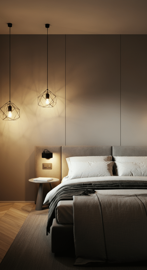 Instead of decorative chandeliers, opt for clean geometric fixtures. Pendant lights with simple shapes or wall-mounted reading lamps maintain visual clarity.