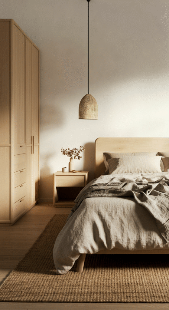 Wood, cotton, linen, stone, and clay textures add character without overwhelming the design. Light wood furniture works especially well in Zepto-inspired bedrooms.