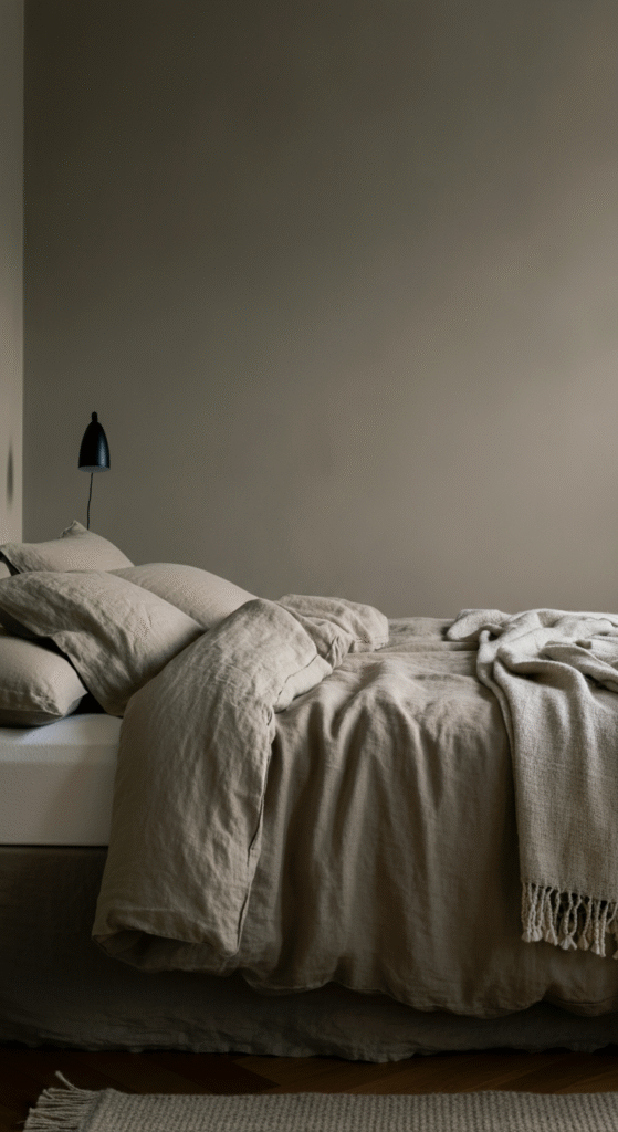 Choose high-quality bedding with simple patterns or solid colors. Neutral throws and cushions add warmth without visual clutter.