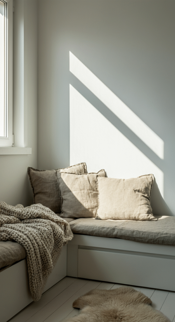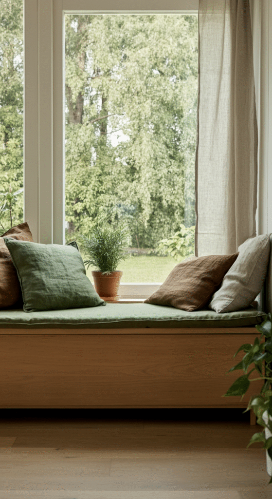 Nothing feels more Nordic than bringing nature right into your home. A window nook that lets you curl up while looking out is probably the dream corner for anyone who enjoys slow mornings with tea or calm evenings just watching the sky change.