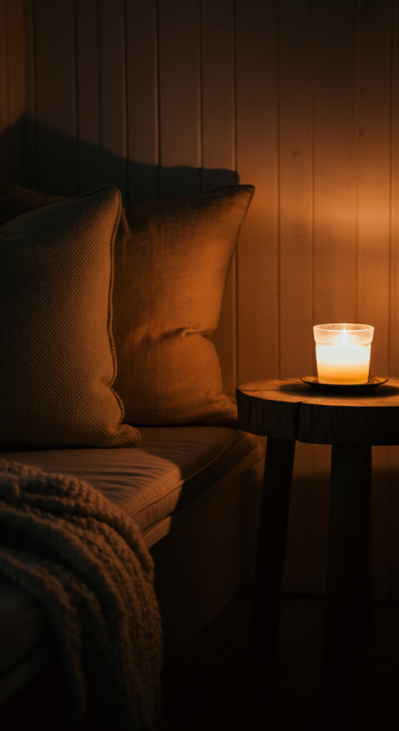 Set up your nook with neutral cushions, a soft throw, and a small wooden side table. Place a few candles in safe holders, either real or LED if you prefer. The soft flicker adds a sense of calm that regular lights sometimes can’t.