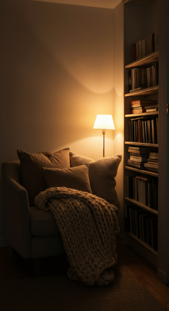 Add a textile pouf, a chunky throw, and a soft lamp with warm light instead of bright white bulbs. Keep a small shelf or a stack of your favorite books nearby. A wool rug under your feet completes the experience.