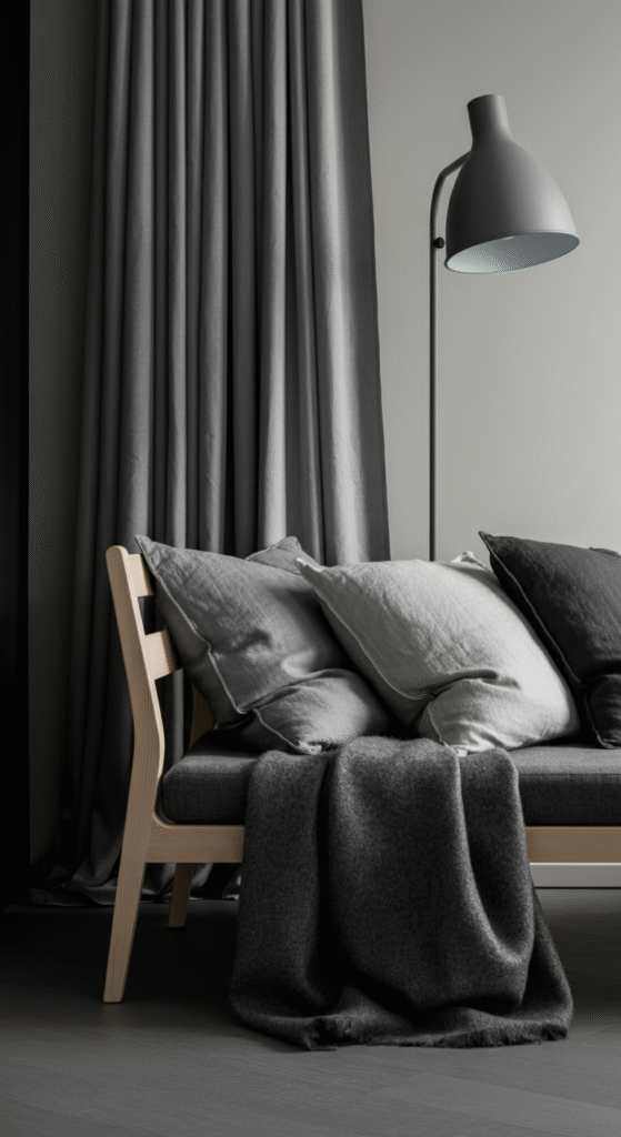 If your bedroom is tiny, don’t worry. Nordic design thrives in small spaces. A compact nook near a wall corner or at the end of the bed can look stunning with just the right elements. A slim cushion, one throw blanket, and a single wall shelf with books or decor is enough.