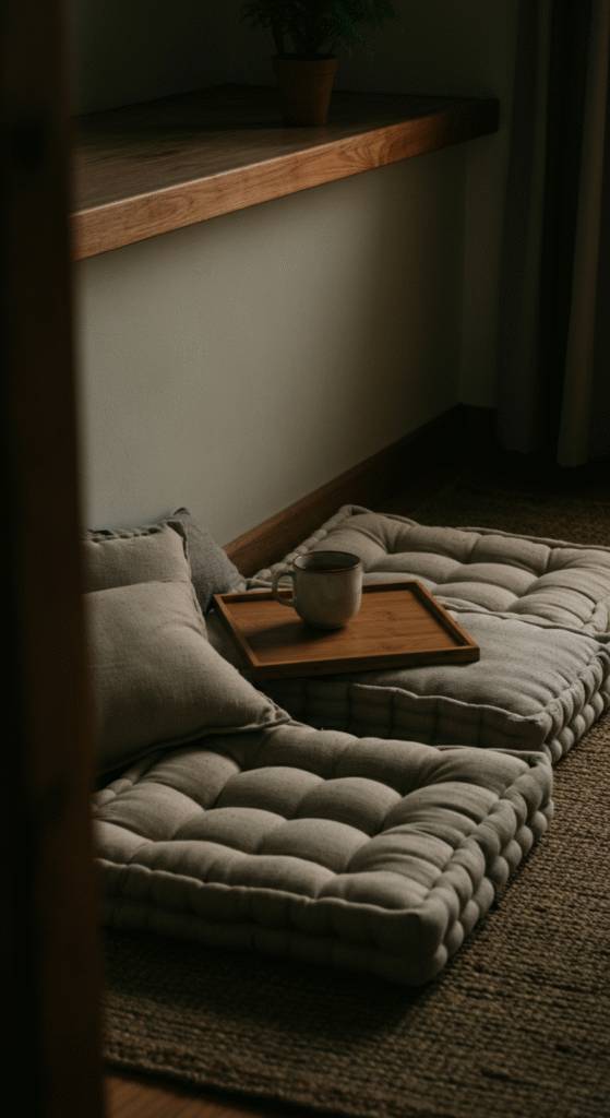 A floor based Scandinavian nook brings a very grounding, peaceful energy. With a thick floor cushion, low bench, or even a mattress-like pad, you can create a soft corner that feels closer to nature. Add a wooden tray, a warm cup of tea, or a soft knitted blanket for comfort.