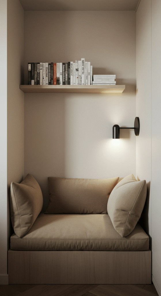 This one’s for people who want to wrap themselves in softness. Hygge is a Danish concept that celebrates comfort, coziness, and small joys. A reading nook inspired by hygge means warm lighting, plush cushions, soft textiles, and a small space that feels almost like a warm hug.
