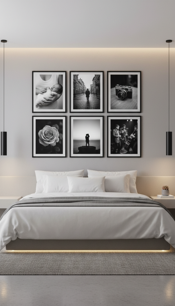 - Create a gallery wall above the bed using matching frames with generous white matting.