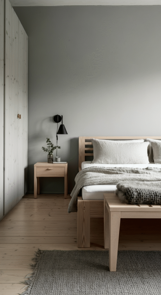 Scandinavian design embraces functionality and simplicity, making it a perfect fit for rustic layouts. A Scandinavian rustic bedroom layout uses light-colored wood, pale walls, and subtle pops of color to create a serene environment. A soft, woolen throw or sheepskin rug can make the space feel warmer and more inviting.