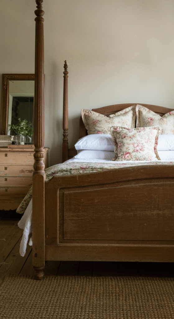 A wooden bedframe is a must. Additionally, consider vintage or reclaimed wooden furniture, such as a nightstand or dresser, for that authentic rustic feel.