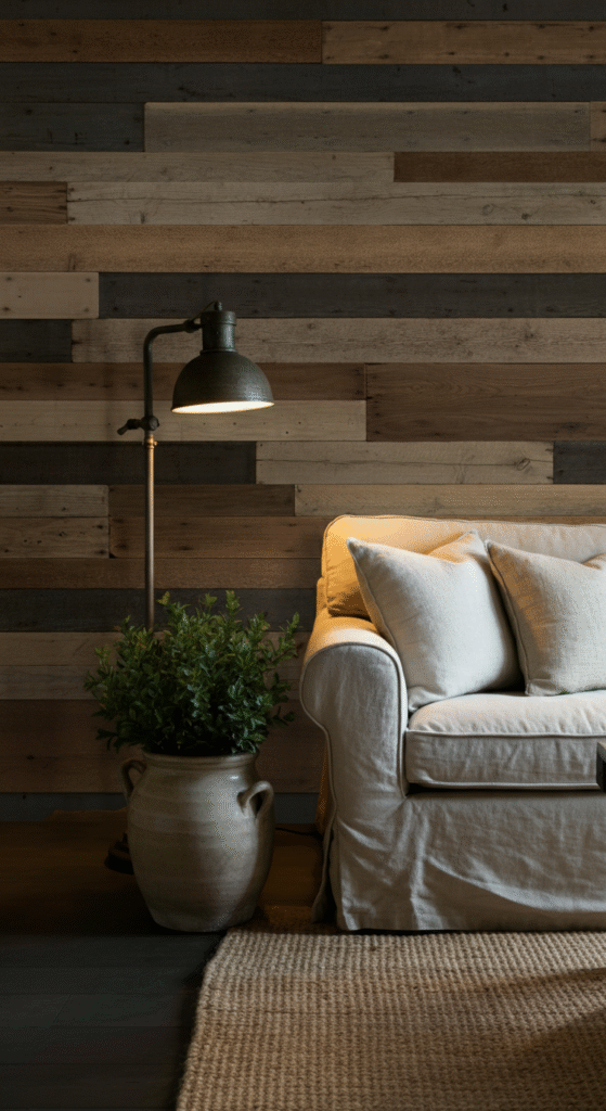 Pair the wood wall with neutral furniture, linen throws, and iron fixtures to balance the ruggedness with softness.