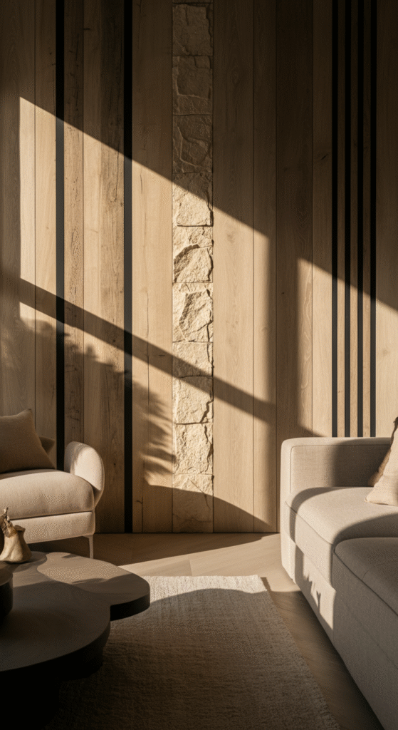 Stone veneer panels are easier to install and maintain than full masonry while still capturing that earthy warmth. Light-colored stones like limestone or sandstone brighten the space, while darker tones create a moody, cozy effect perfect for evening relaxation.