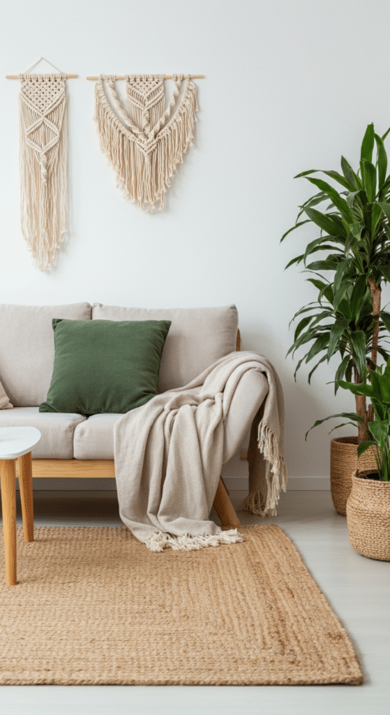 Think large macramé pieces, handwoven tapestries, or even jute and wool art panels. These handcrafted details bring an artisanal touch to the room, softening the architecture and grounding the space.