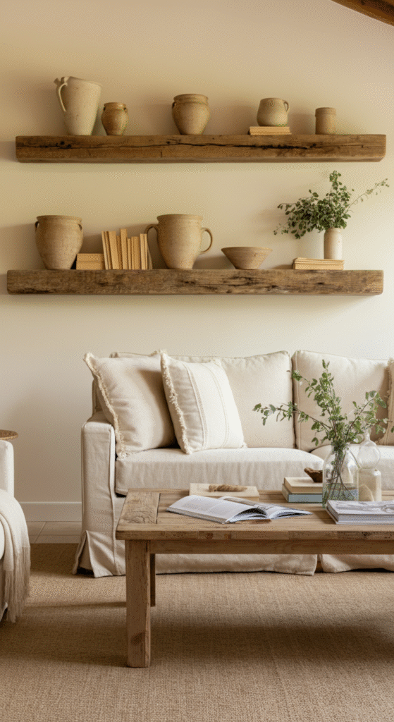 Floating wooden shelves made from reclaimed or raw-edge wood add function and style to rustic-chic walls. Decorate them with ceramic pottery, antique books, or small potted plants for an organic yet refined look.