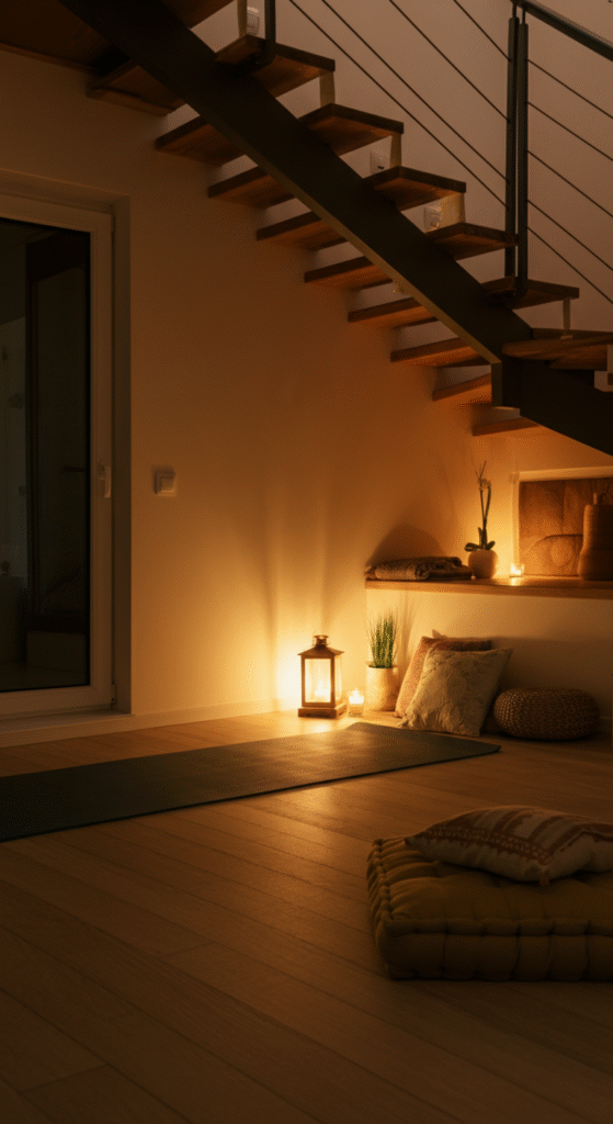 Last but certainly not least, why not turn your under-stairs space into a serene meditation or yoga corner? With the simplicity of Scandinavian design, you can create a peaceful retreat with a yoga mat, cushions, and calming elements like candles or plants.