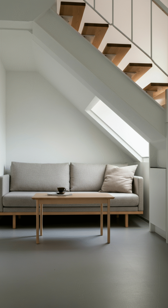 Understairs spaces are usually tight, but a compact Scandinavian sofa section can make the area both stylish and functional. Look for a minimalist design with a low-profile, neutral-colored sofa. Add some throw pillows for comfort and texture.