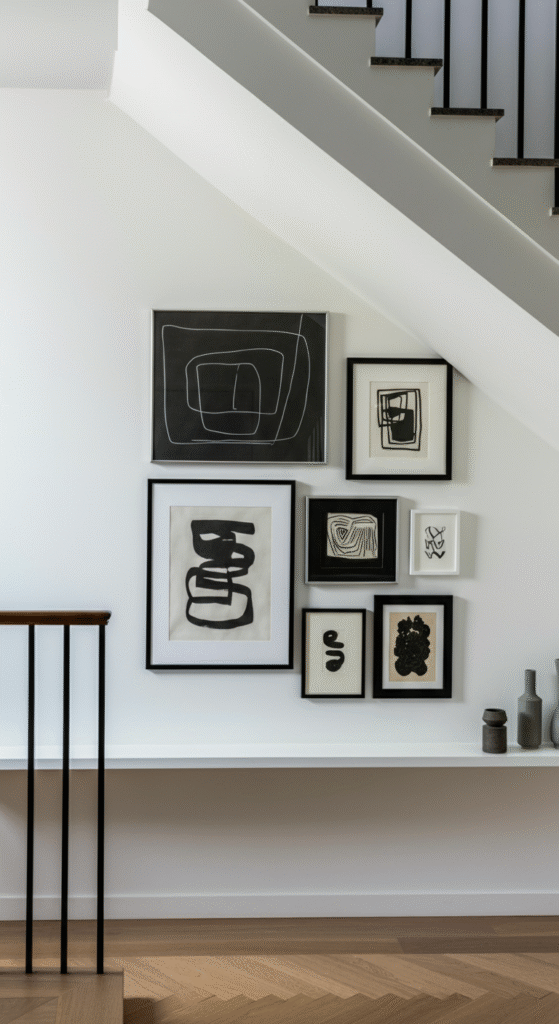 Key Elements: Minimal frames, floating shelves, and thoughtful artwork selection.