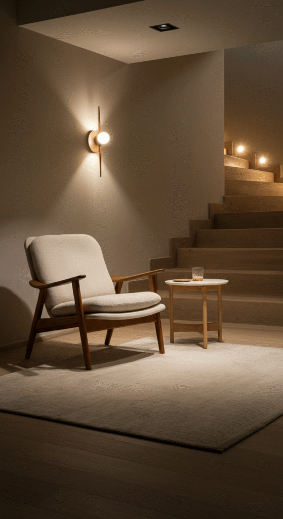 For an elegant twist, consider placing iconic Scandinavian chairs like the Eames lounge chair or a stylish armchair under the stairs.